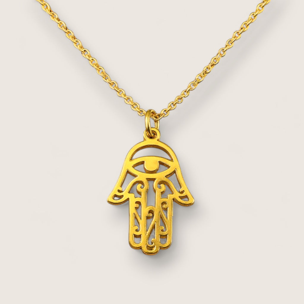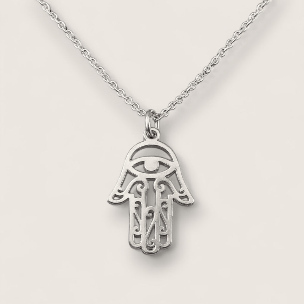 A timeless talisman of protection and good fortune, the Guardian’s Grace pendant showcases the iconic Hamsa hand with an intricate openwork design and central eye motif. Measuring 13mm wide by 25mm tall, it’s available in radiant 18K gold plating or polished steel. Paired with an 18" sterling silver chain plated in matching rhodium or 18K gold, this piece is both a statement of style and a symbol of spiritual safeguarding.