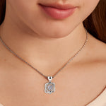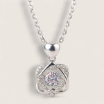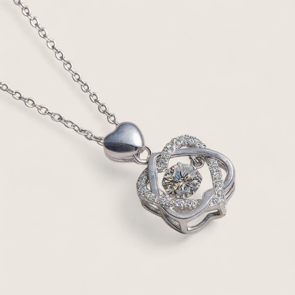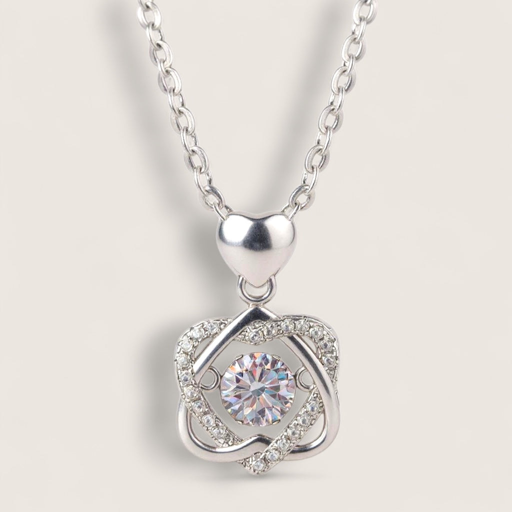 ThThis elegant sterling silver necklace features a heart-shaped bail and an intricate infinity-style frame adorned with sparkling cubic zirconia. At its centre, a suspended “dancing” CZ stone shimmers with every movement, catching light from every angle. Finished with a polished sterling silver chain, this piece offers timeless charm and romantic sparkle for any occasion.