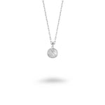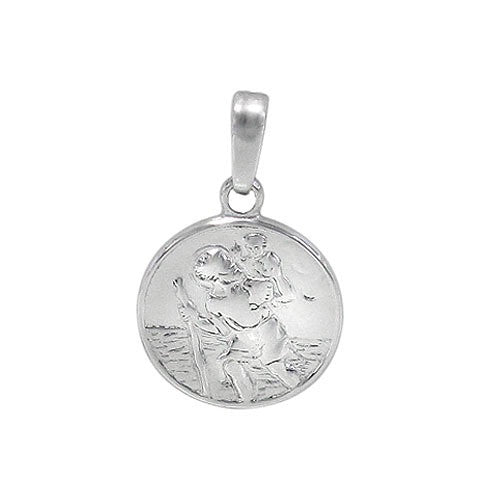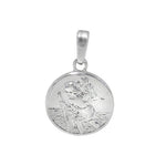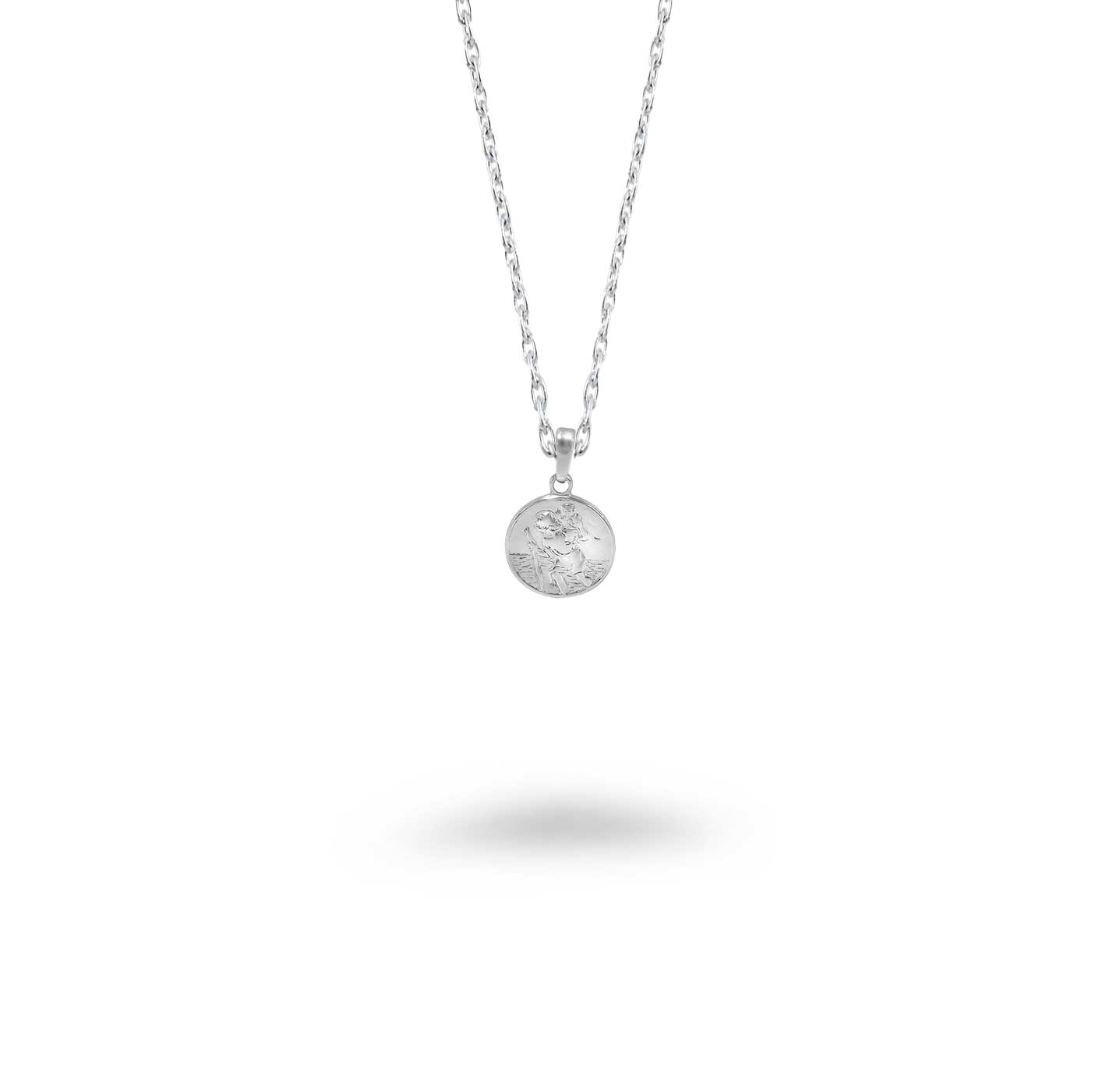 Rhodium-plated on Sterling Silver, Saint Christopher pendant. Approximate frame size: 16mm Diameter x 1.5mm Thickness. Paired with a sterling silver necklace.