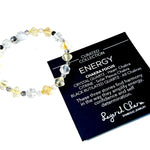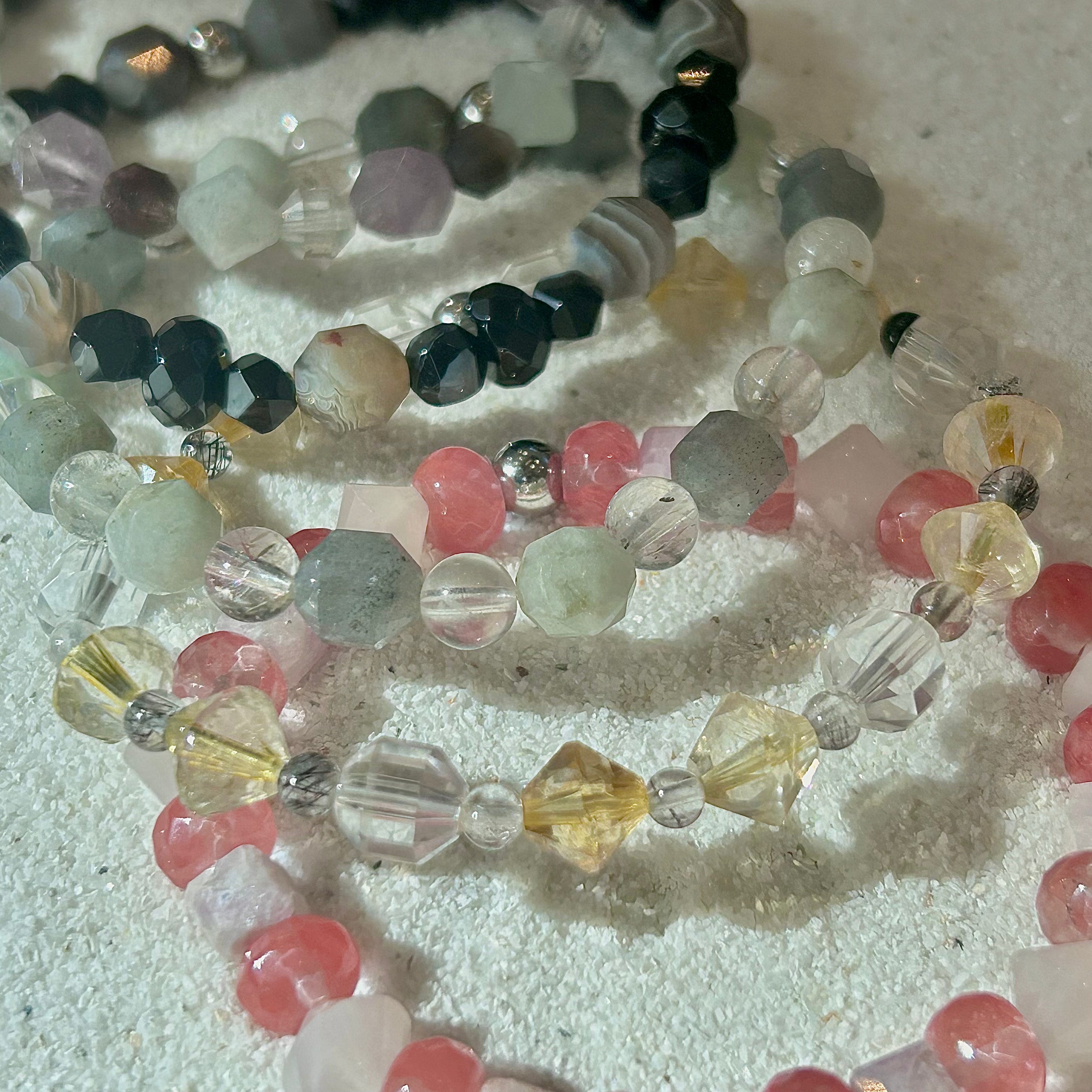 The current stone harmony features Crystal Quartz 8mm Natural Energy Prism Faceted,Citrine Natural 8mm Bicone Faceted, Black Rutilated Quartz 4mm Round. All gemstones are natural and variations in color and shape can occur.