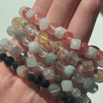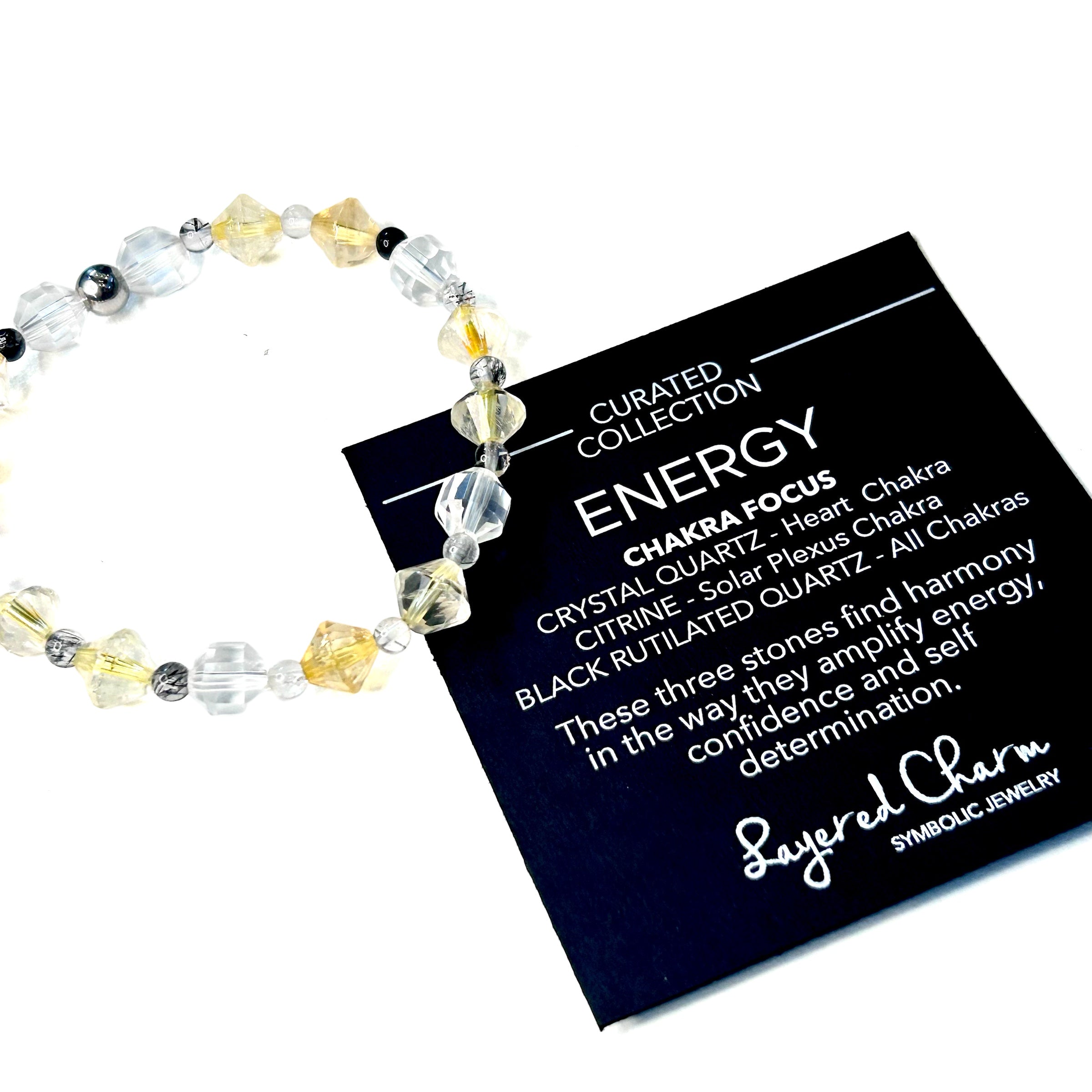 The Layered Charm Curated Bracelet Collection is a limited production of rare gemstones with unique cut designs to sparkle and show off the beauty of the natural stone. We have curated this bracelet with gemstone beads of a premium grade that amplify and complement a focus on "Energy" within our chakras.