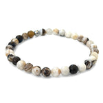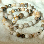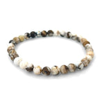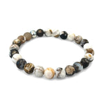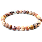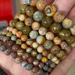Rocky Butte Jasper is mined in Oregon and may have either dendritic or landscape qualities. It may also be called Rocky Butte Picture Jasper. The combination of color and pattern variation are reminiscent of Red Creek Jasper, although the colors are much more muted. Rocky Butte Jasper strands are predominantly shades of gray, brown and tan with some beads or inclusions of rust and rose.