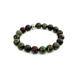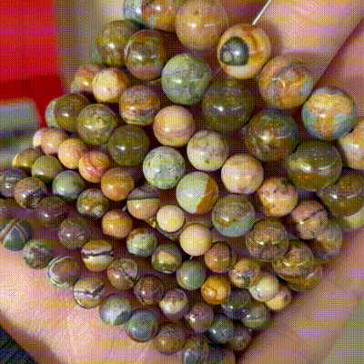 Named for the village near where it is found in Madagascar, Kabamby Ocean Jasper was first mined in 2002. It is known for its colours -- dark green and mustardy yellow, with accents of pink, red and white -- as well as for its opacity and patterns. Ocean Jasper is a commercial name for Orbicular Jasper, a variety of Jasper containing variably coloured spherical patterns. It forms when Quartz and Feldspar crystallize in radial aggregates within other silica-rich stones, Rhyolite or Tuff. Ocean Jasper is believed to be linked to the lost city of Atlantis and to hold mystic knowledge.