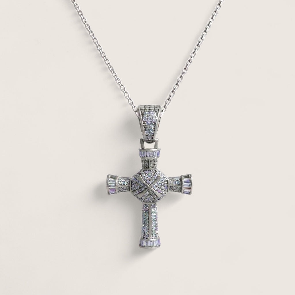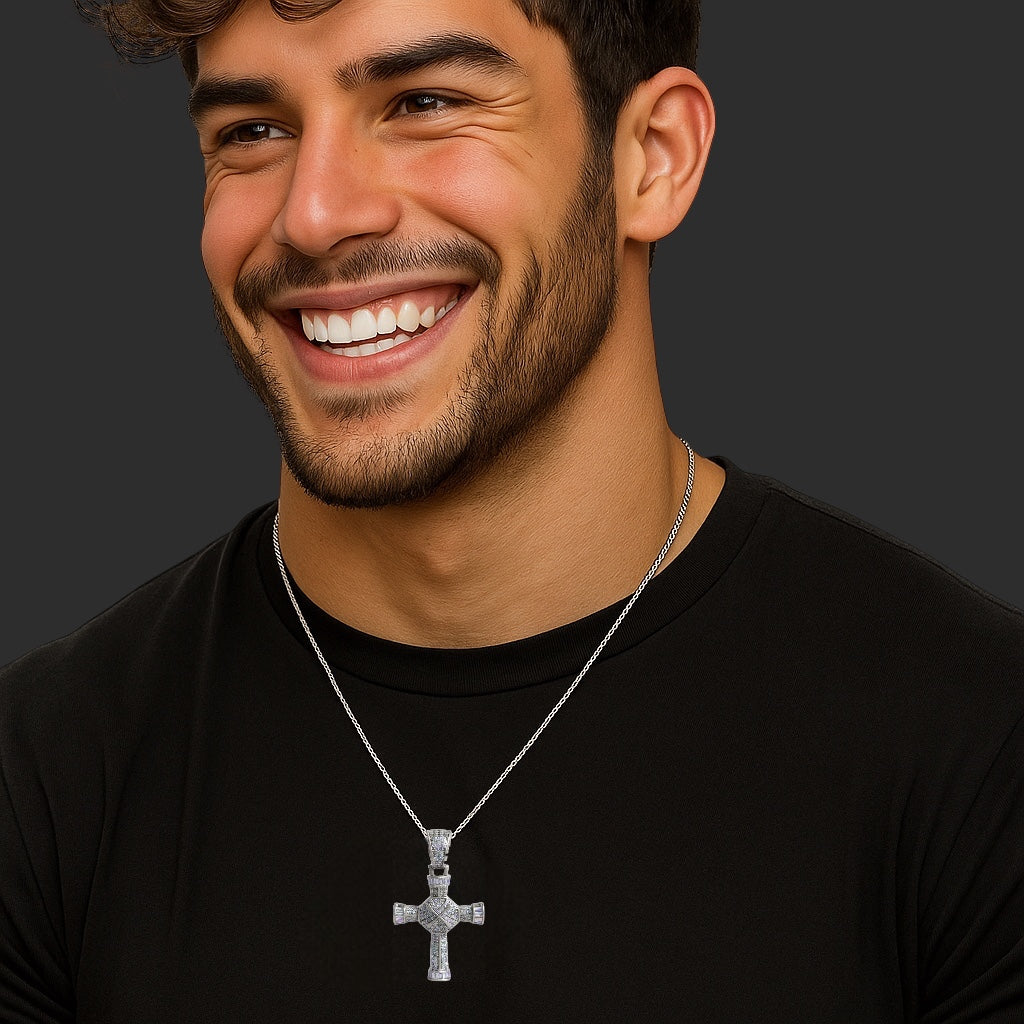 Bold yet refined, The Radiant Pillar features a 26x35mm cross pendant encrusted with dazzling cubic zirconia, combining baguette and round cuts for a striking display of brilliance. A faceted dome center adds dimension and lightplay, while clean sterling silver craftsmanship anchors the design in timeless elegance. Paired on a matching sterling silver chain, this piece is both a statement of faith and a symbol of strength.