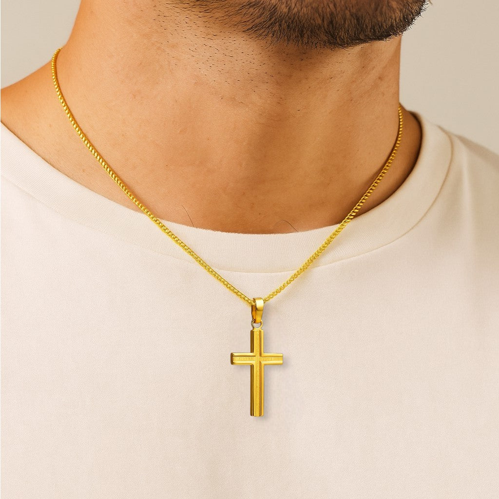 A symbol of strength, faith, and timeless style, this cross necklace is crafted in sterling silver and richly plated in 14kt gold for a warm, enduring glow. The pendant measures 25mm x 16mm, featuring a clean and elegant design that catches the light with subtle refinement. Paired with a premium 2.1mm stainless steel curb chain, also plated in 14kt gold, at a versatile 20" length—this piece blends durability with sophisticated shine, making it perfect for both everyday wear and special occasions.