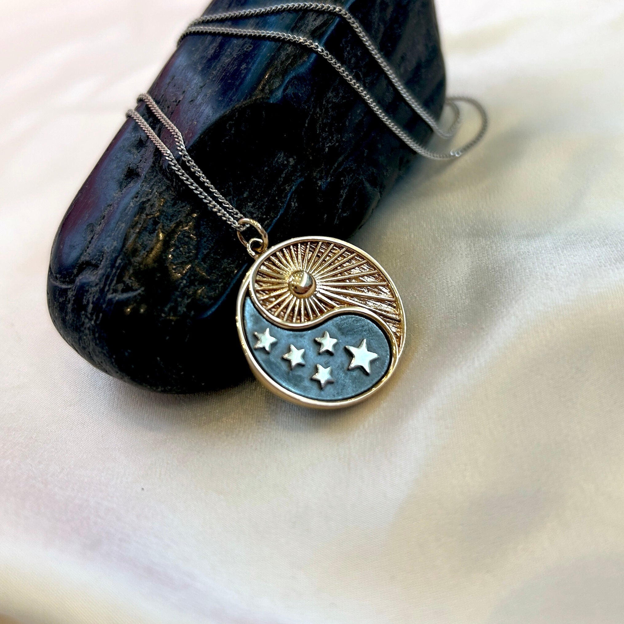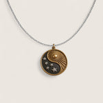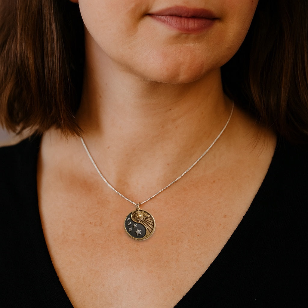 Discover radiant elegance with our Mixed Metal Sunray on one side of the yin, while the stars of the yang Necklace. This captivating piece features a 30x24mm round sterling silver pendant adorned with a meticulously hand-finished bronze sun and delicate rays of light, sterling silver stars.