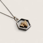 Elevate your style with our sterling silver hexagon-shaped pendant, measuring 17mm in height and 13mm in width, and featuring a meticulously crafted bronze bee at its heart. This exquisite piece combines contemporary design with the beauty of nature. The detailed bee motif adds a touch of whimsy and an air of sophistication. Paired with a rhodium-plated sterling silver 18" chain, this necklace offers timeless elegance and versatility, suitable for any occasion. Whether you're a nature enthusiast or simply seeking a unique and stylish addition to your collection, this pendant necklace seamlessly blends artistry and craftsmanship, making it a charming and versatile accessory.