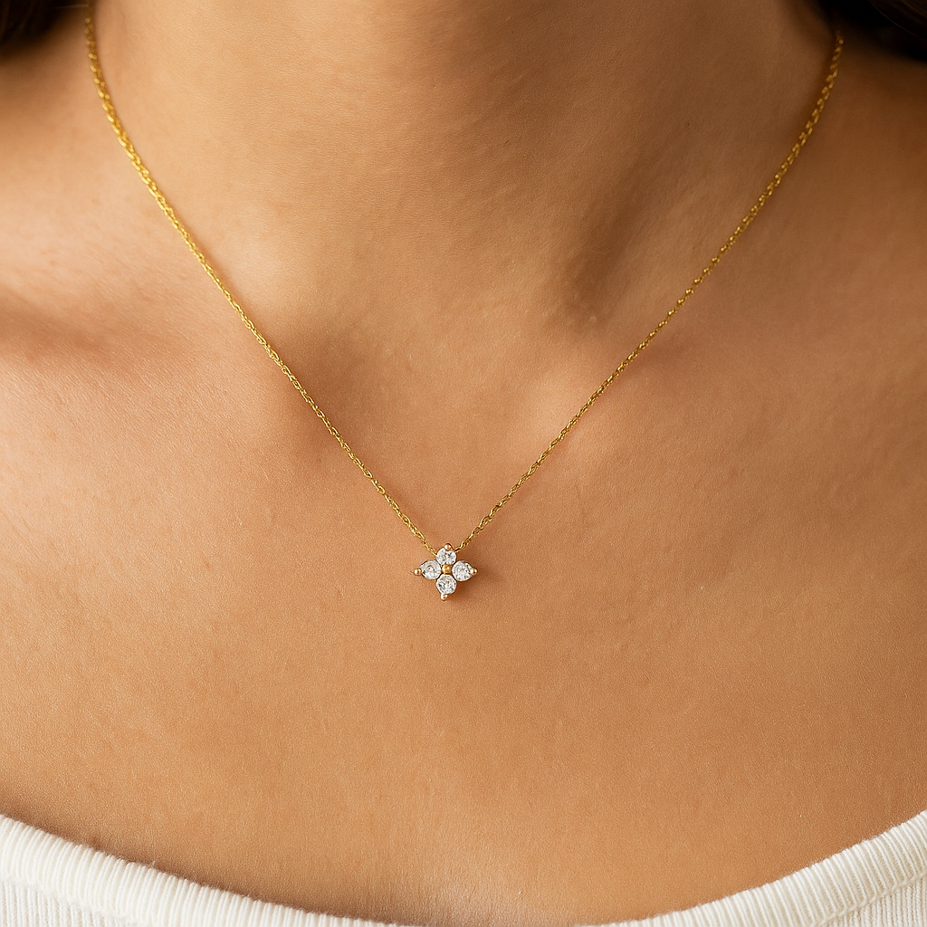 Crafted from sterling silver and available in luminous rhodium plating or warm 18KT gold plating, this piece glows with timeless elegance. Suspended on an adjustable 16"–18" chain, it rests gracefully near the collarbone — a sparkling reminder to always let your inner light bloom.
