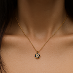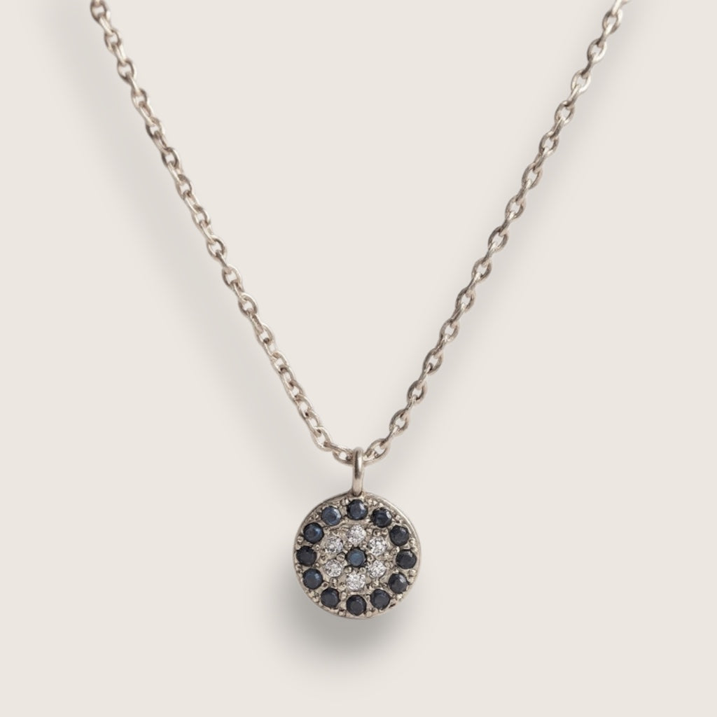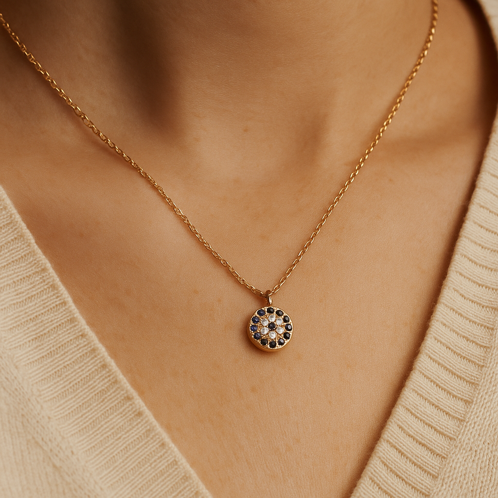 Embrace timeless protection and style with our Small Round Blue and White CZ Evil Eye Pendant Necklace, a piece that adds elegance and meaning to any look. This pendant features a beautifully crafted, round evil eye design symbolizing warding off negativity and attracting good fortune. At its heart, a stunning blue cubic zirconia stone represents the "eye," surrounded by a halo of clear white CZ accents that shimmer with every movement, creating a dazzling, protective focal point.