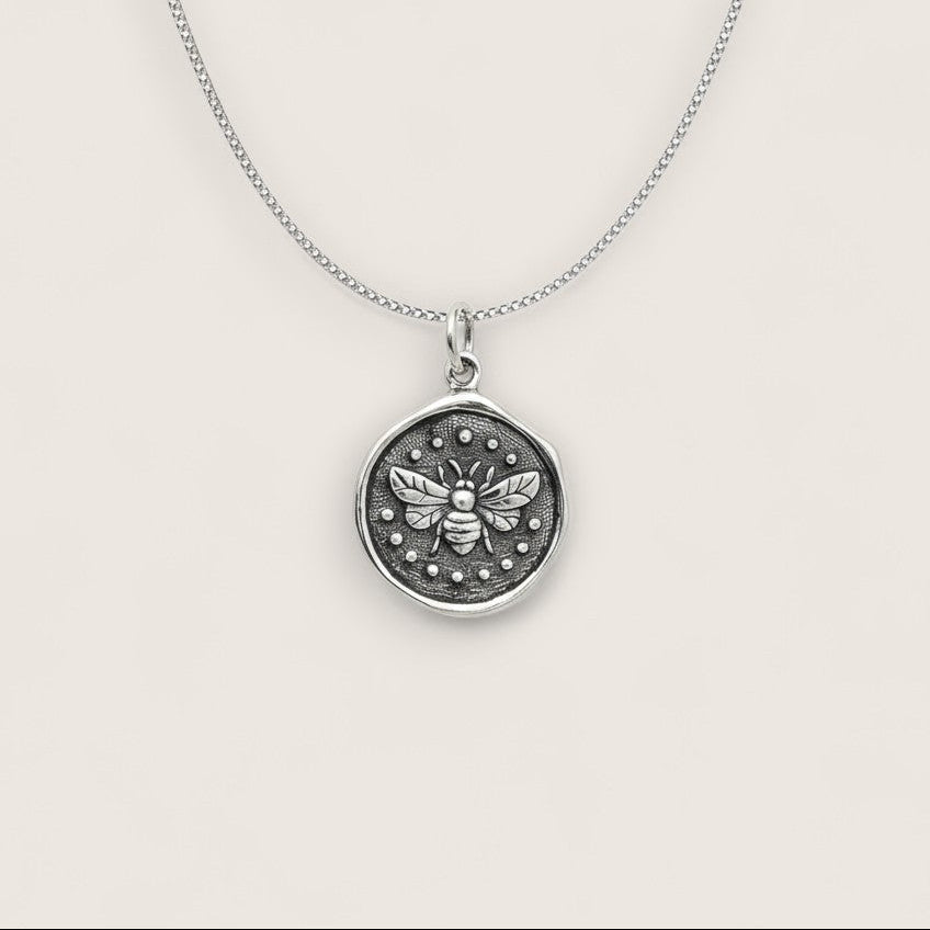 This sterling silver wax seal bee pendant sparks our need for strong friendship. The bee print pendant is adorned with an uneven edge and a series of tiny dots that give it an extra special touch.
