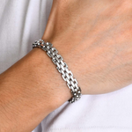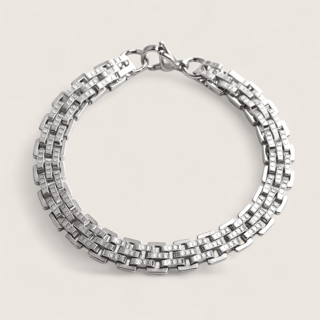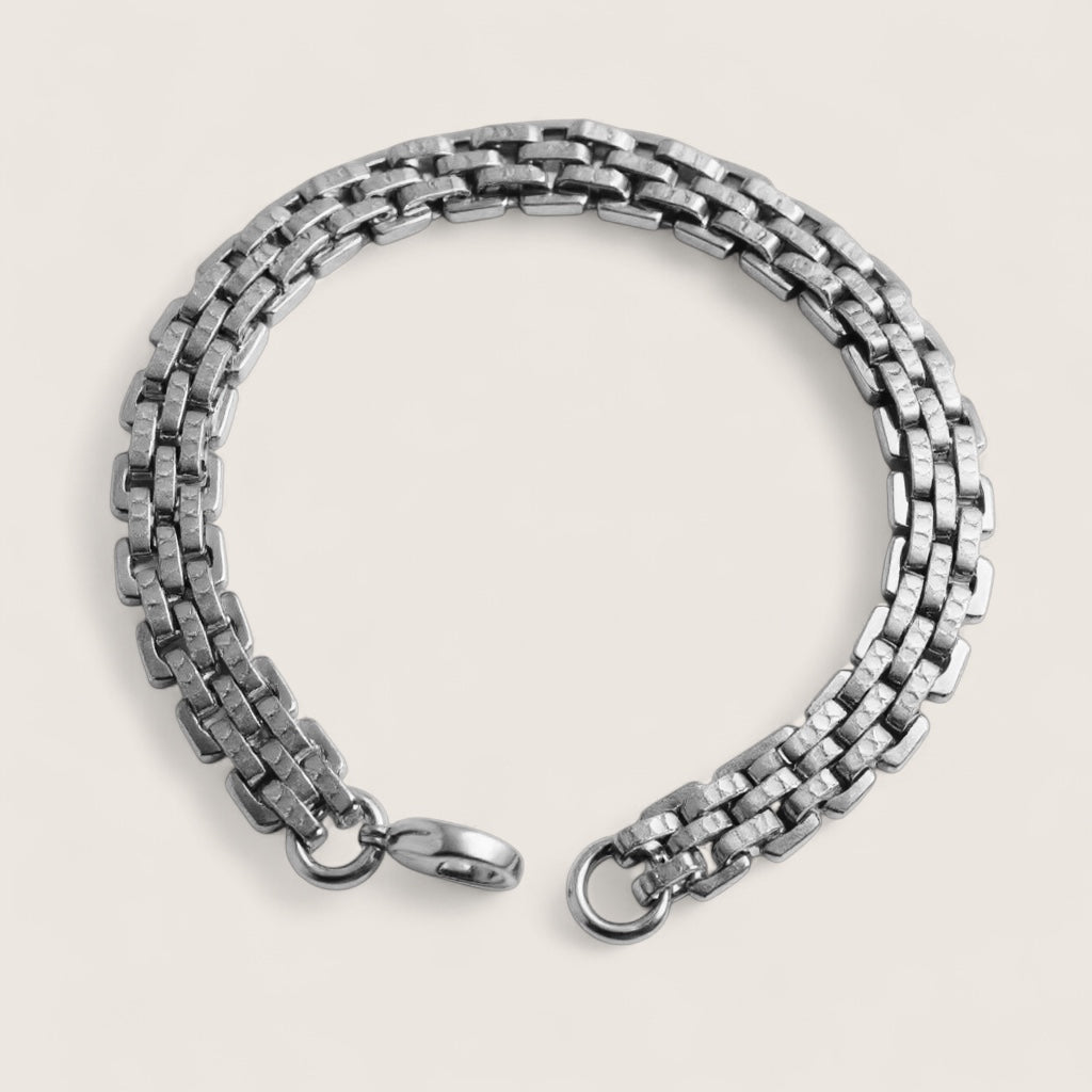 Engineered for strength and style, the Powerlink from Anvil&Ore’s Voltage Collection features a bold 8.8mm width of interlocking, textured links forged in premium stainless steel. At 8.25" in length, it delivers a substantial presence on the wrist while maintaining all-day comfort. The multi-row design adds depth and dimension, reflecting light with every movement for a look that’s both industrial and refined. Built to withstand the rigours of everyday wear, this bracelet is a statement of resilience and confidence.