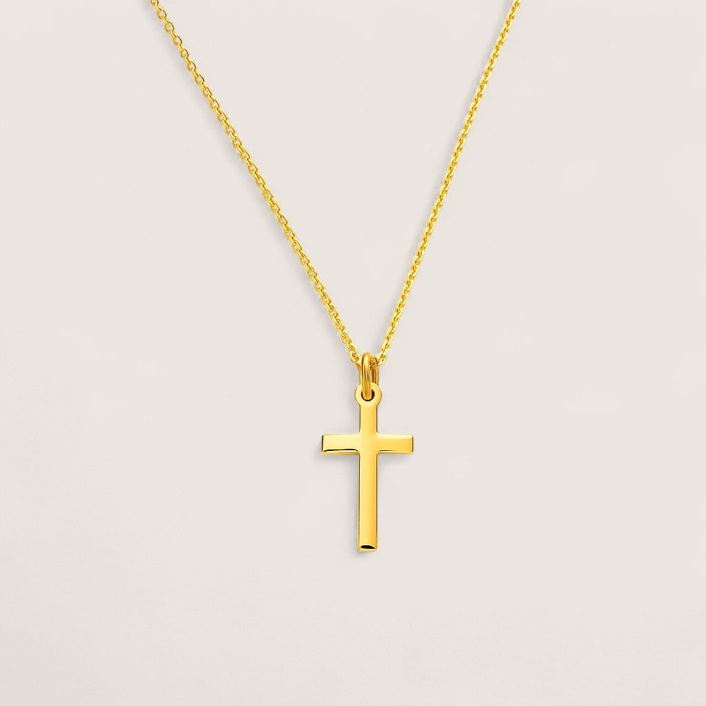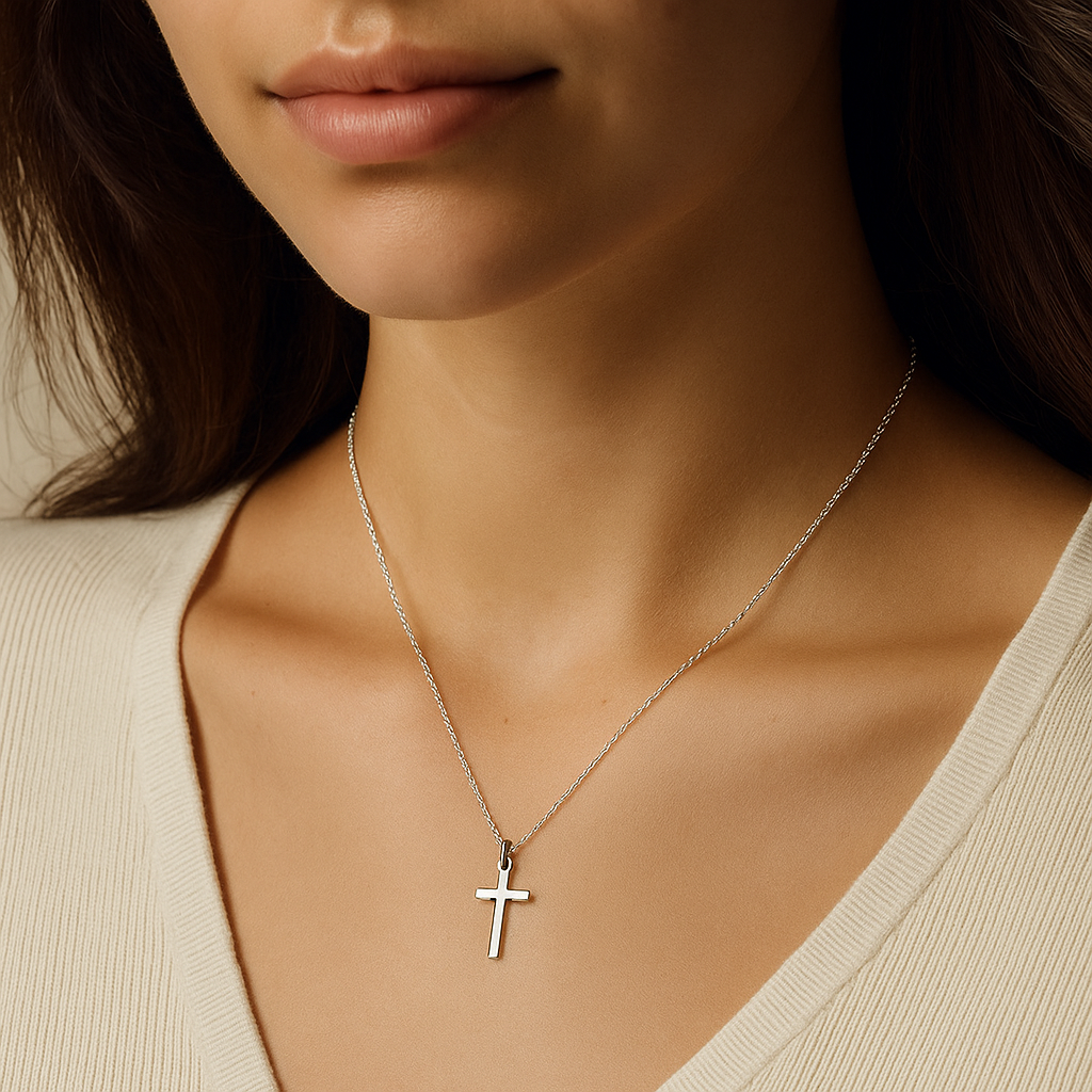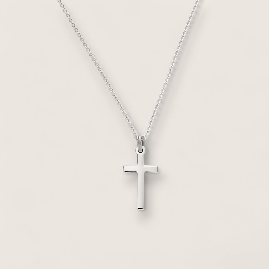 Simple, elegant, and timeless, the Pure Faith pendant features a polished cross design that symbolizes devotion and hope. Measuring 9mm wide by 19mm tall, it’s available in polished steel or radiant 18K gold plating. Paired with an 18" sterling silver chain plated in matching rhodium or 18K gold, this understated piece is perfect for daily wear or as a meaningful gift.