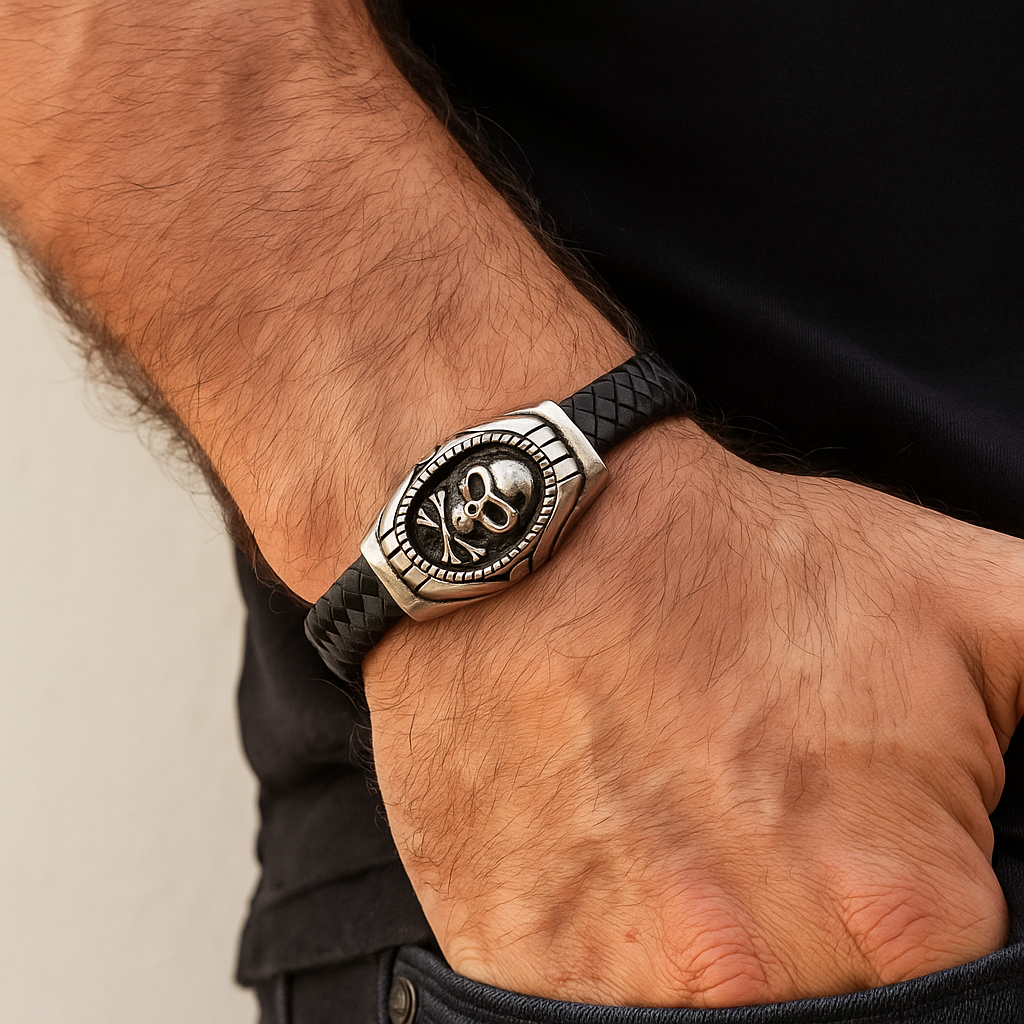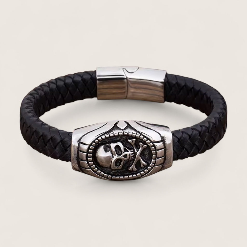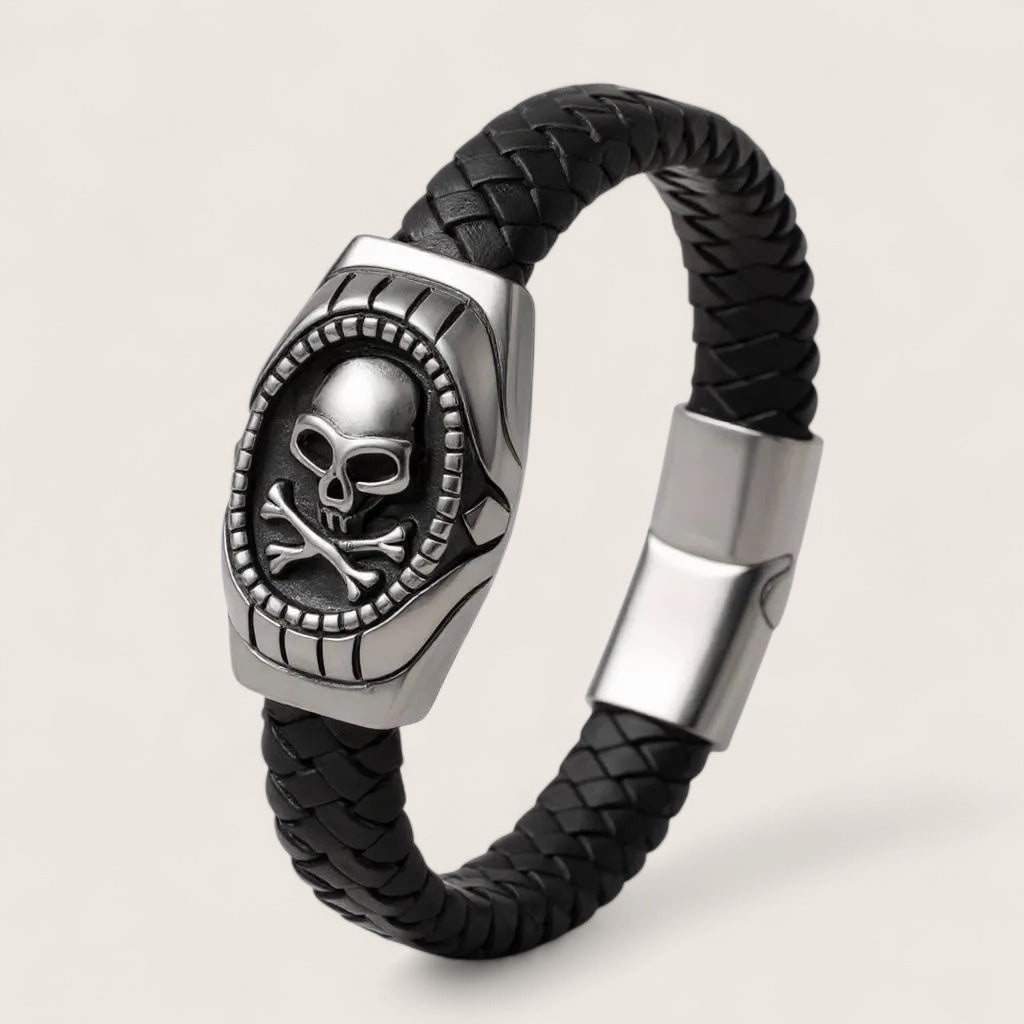 Embrace your fearless side with The Reaper’s Oath, a bold fusion of rugged craftsmanship and rebellious spirit. The thick, premium black braided leather band is anchored by a striking stainless steel centrepiece, showcasing a detailed skull and crossbones framed in battle-worn edges. Built for those who live by their own code, its secure magnetic clasp offers all-day comfort, while the tarnish-resistant stainless steel ensures it endures as long as your resolve.