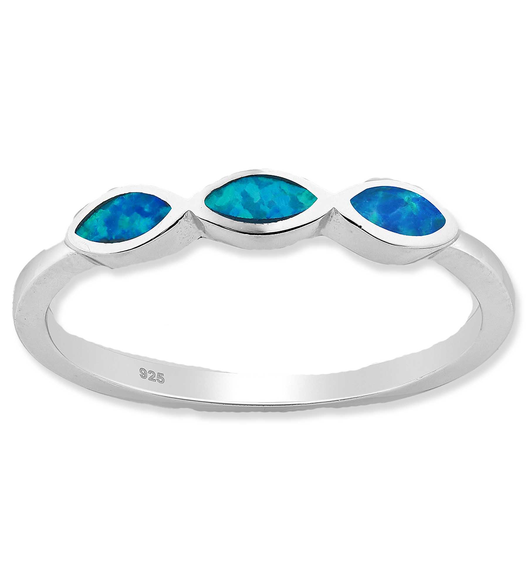 This 925 sterling silver ring features a delicate design with a topper of three marquise-shaped lab-created opals. Their mesmerizing play of colors captures the essence of opalescent beauty, creating a striking and sophisticated look.