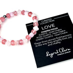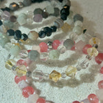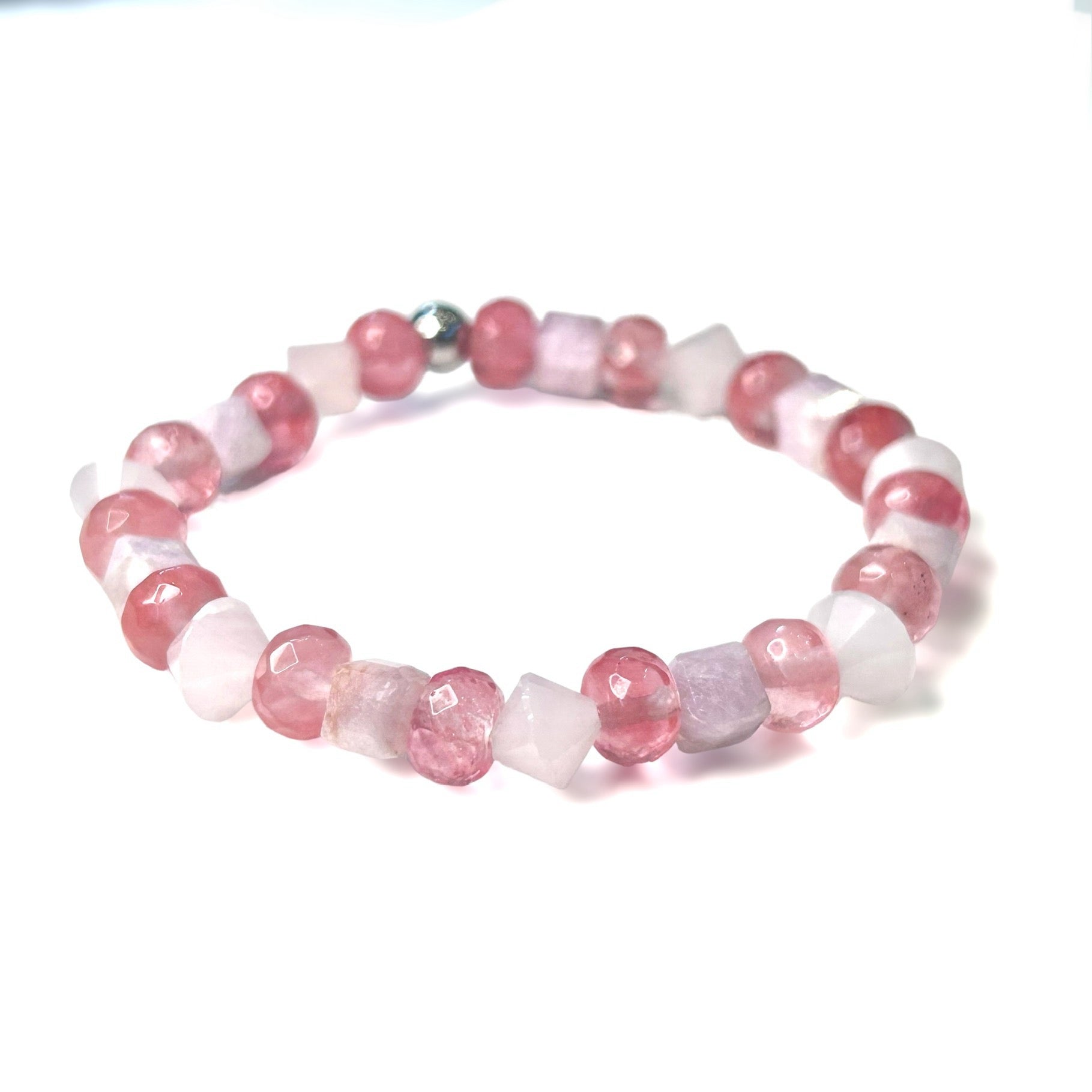 The current stone harmony features Kunzite 6-7mm Table Cut Cube, Rose Quartz 8mm Bicone Faceted, Cherry Quartz 8mm Faceted Rondelle. All gemstones are natural and variations in color and shape can occur.