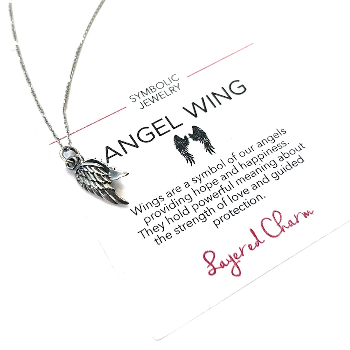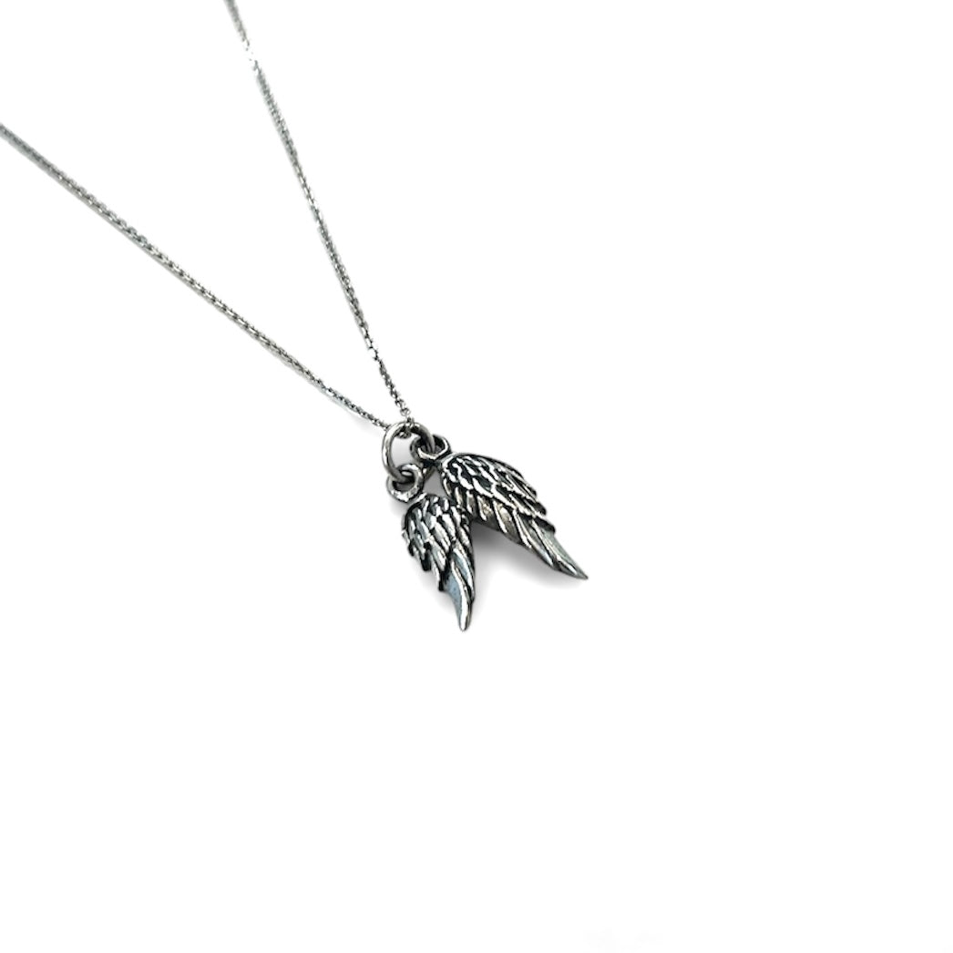 Sterling Silver, two piece, smooth flat Angel’s wing pendant. Approx pendant size: 19mm L x 8mm W x 1.5mm T.Paired on an 18" rhodium treated sterling silver chain.