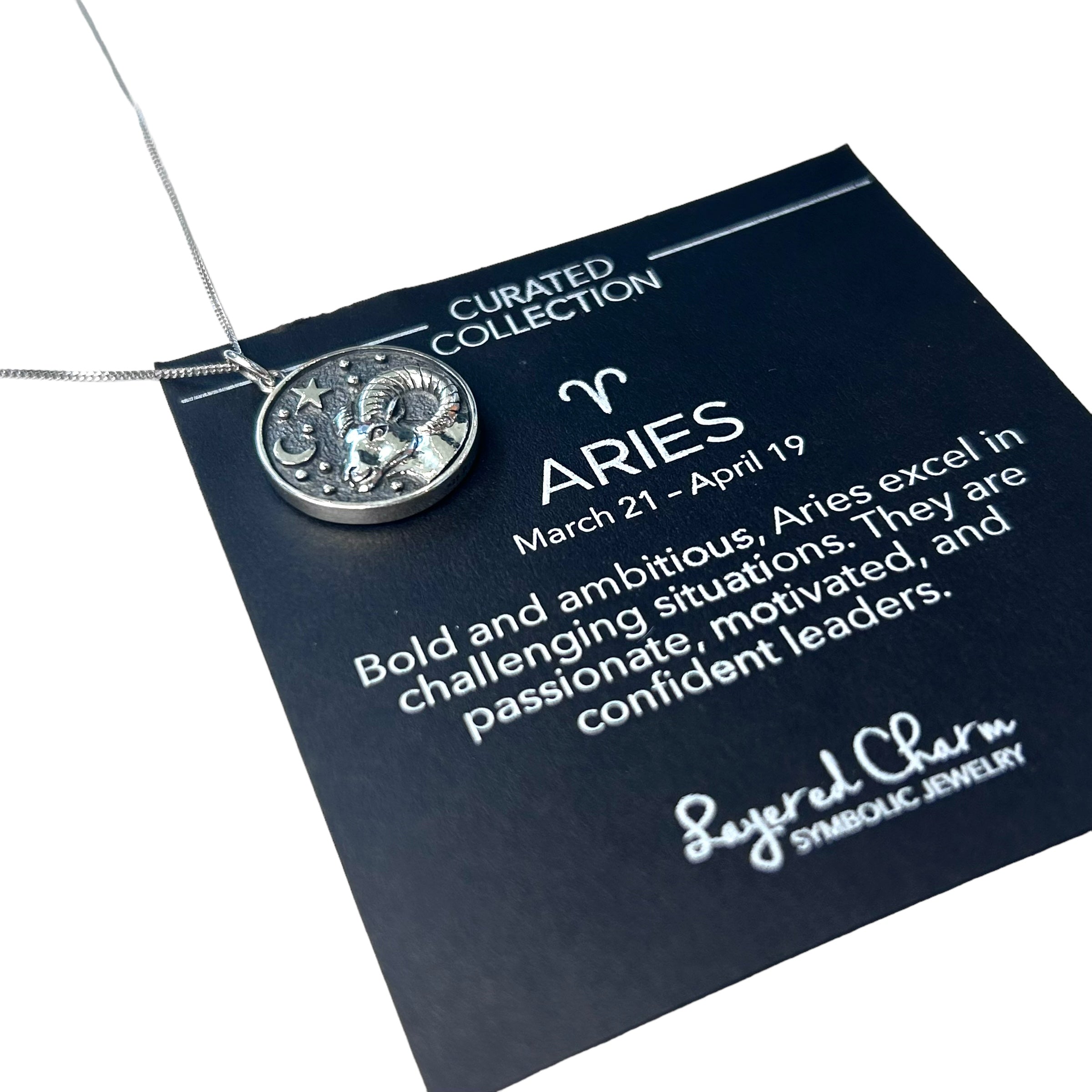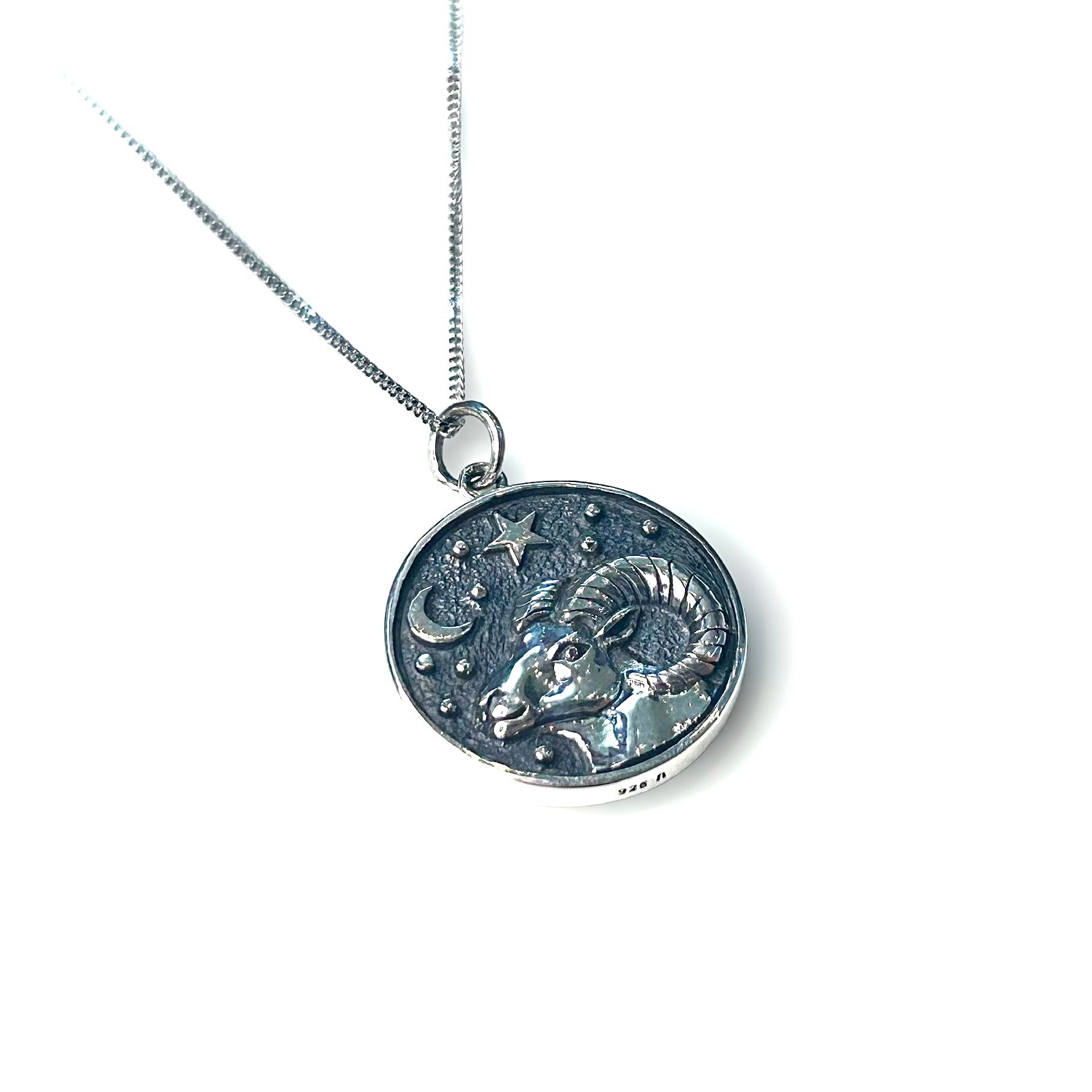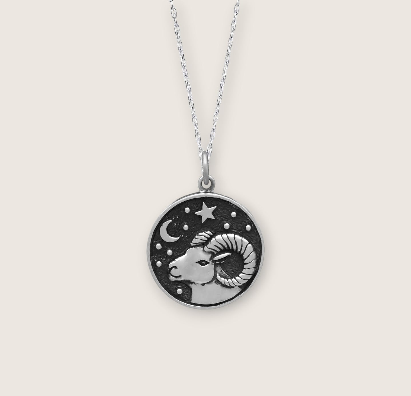 Celebrate fiery Aries with this coin old-world astrological zodiac necklace highlighting the strength & beauty of the Ram.  The reverse side denotes Aries ruling planet: Mars.