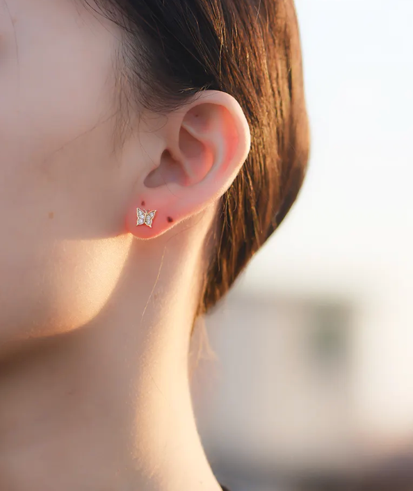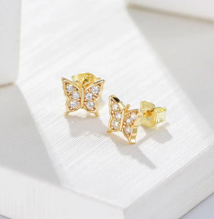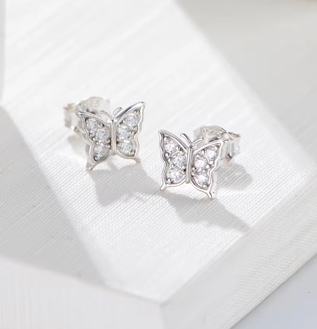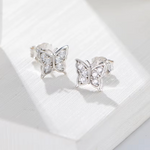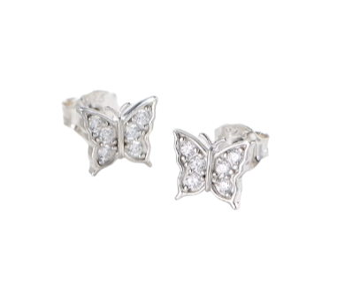 These sterling silver butterfly stud earrings feature cubic zirconia (CZ) embedded wings, adding a touch of sparkle and elegance to the design. The dimensions of each earring are 8mm in width and 7mm in height, making them a delicate yet noticeable accessory. The earrings come with butterfly backs, ensuring they stay securely in place while worn. Ideal for everyday wear or special occasions, these earrings combine the timeless appeal of sterling silver with the brilliance of cubic zirconia.