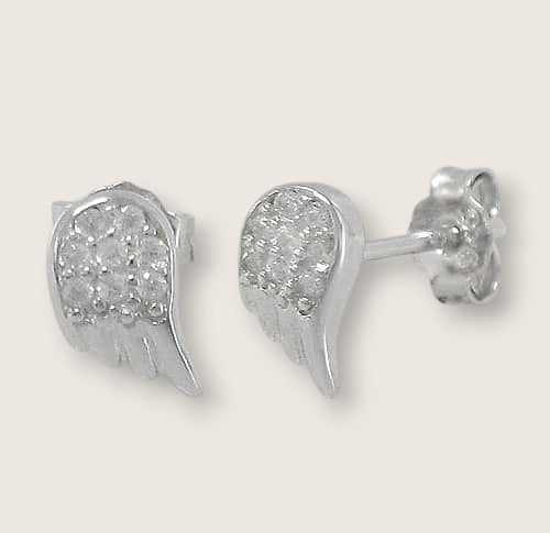 Rhodium plated on Sterling Silver, angel wing stud earring with faceted stone. Approximate frame size: 7mm L x 4mm W.