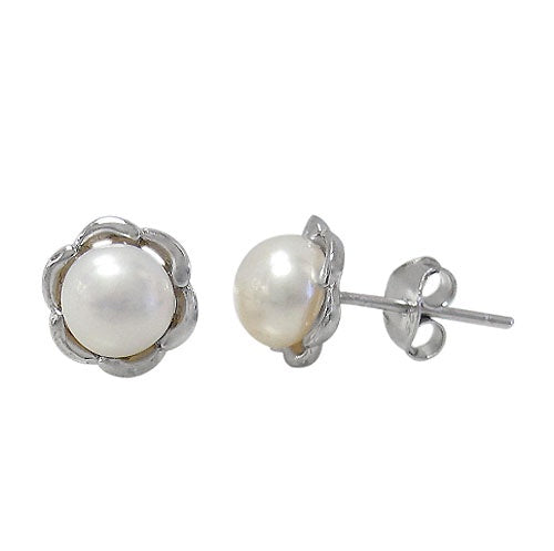 Add a touch of elegance to your ensemble with our Rhodium Plated Sterling Silver Pearl Stud Earrings. These charming earrings feature a 6mm synthetic pearl delicately set within a flower design frame. Crafted from sterling silver and plated with rhodium for enhanced durability and a brilliant shine, these earrings offer a timeless and sophisticated look.