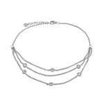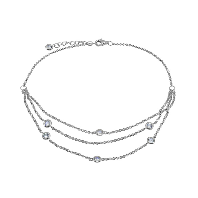 This anklet is made from sterling silver and is coated with rhodium for a luxurious finish. The anklet is set with four millimeter cubic zirconia stones and has an adjustable length of nine inches plus an additional one inch extension.