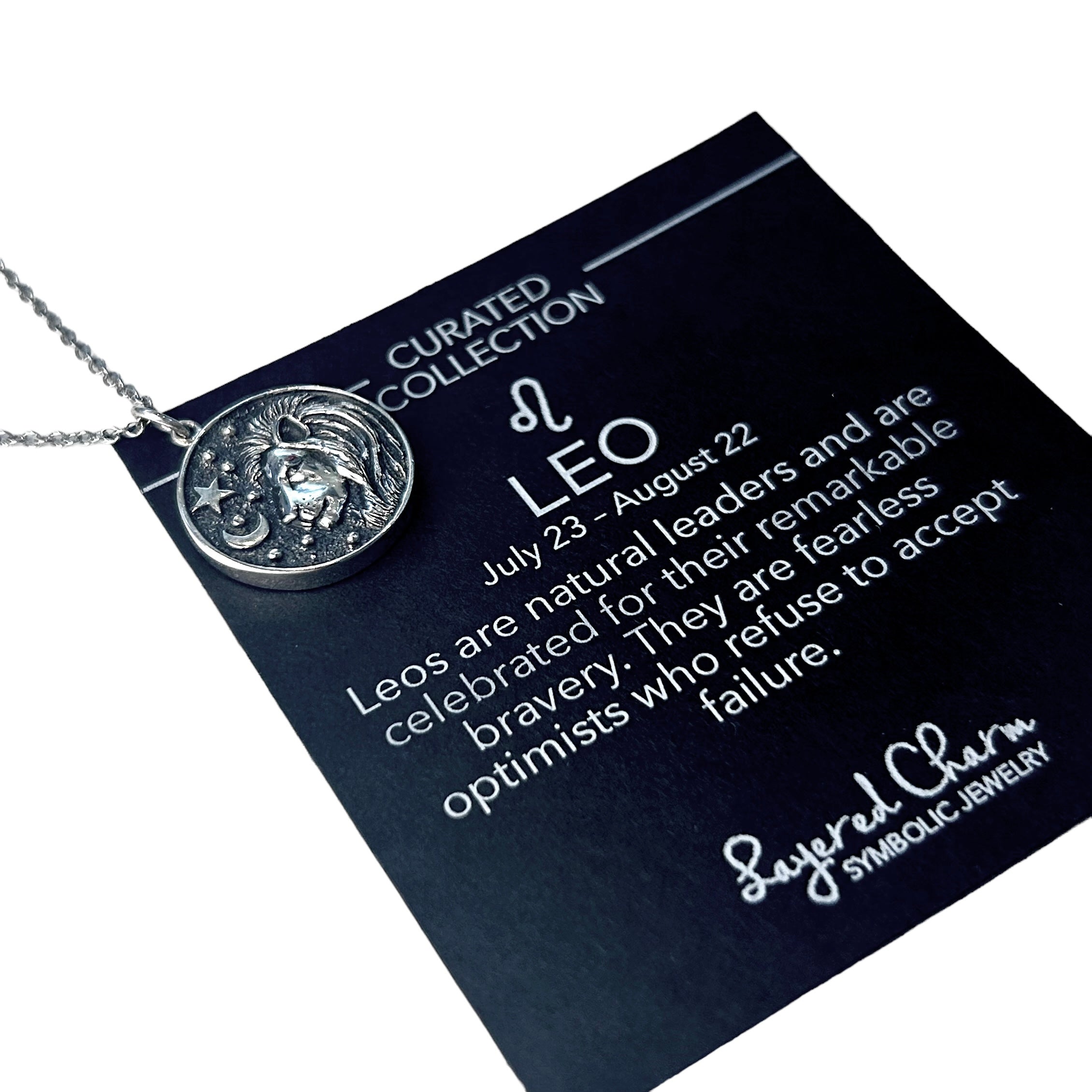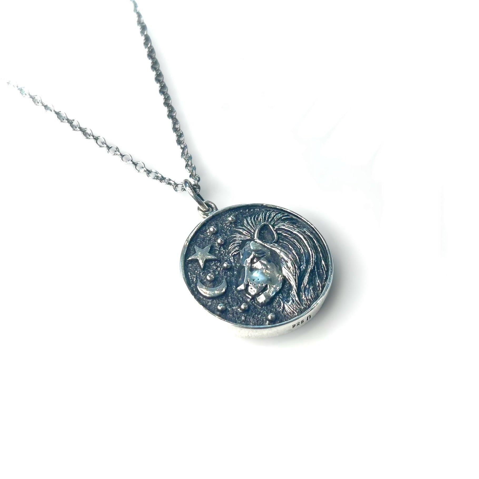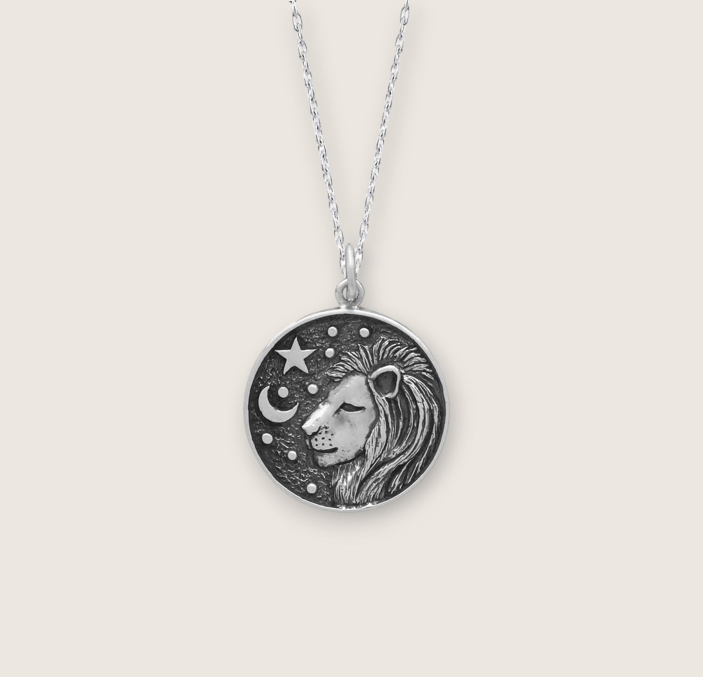 Celebrate fiery Leos with this old-world coin astrological zodiac necklace showcasing the brave Lion. The reverse side denotes their ruling celestial body: the Sun.