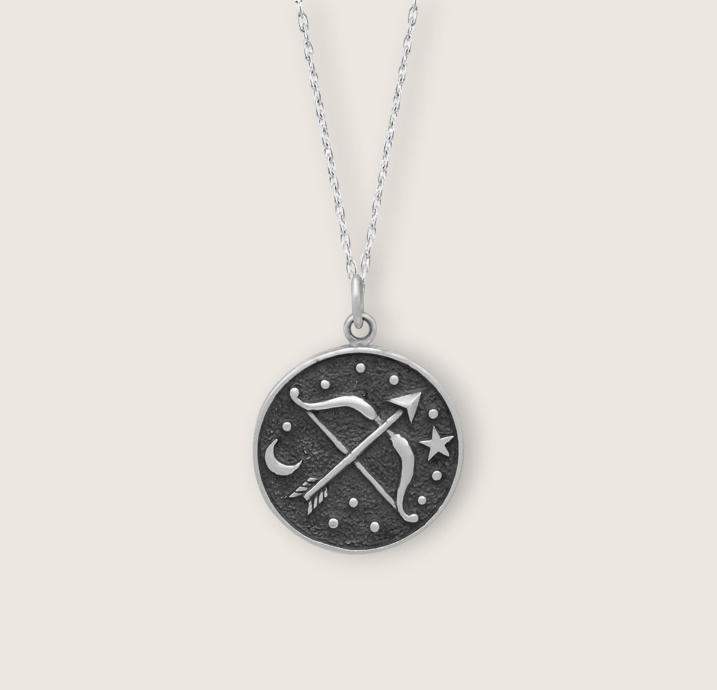 Celebrate exuberant Sagitarrius with this old-world coin astrological zodiac necklace emblazoned with the Archer's bow & arrow. The reverse side denotes their ruling planet: Jupiter.