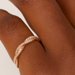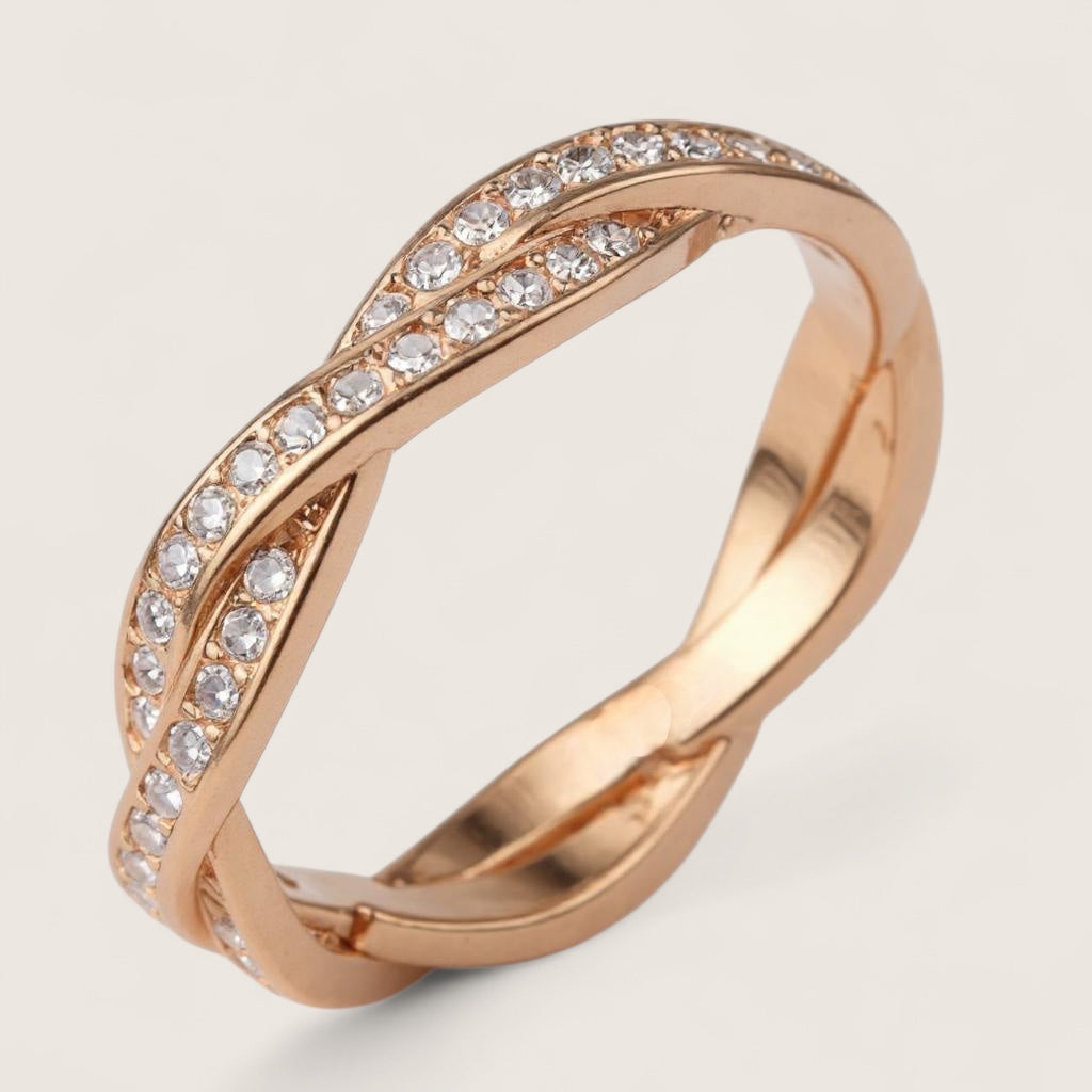 Graceful and radiant, The Seraphine features an elegant infinity twist design symbolizing eternal love and unity. Crafted in sterling silver and finished in warm rose gold plating, the band is encrusted with shimmering cubic zirconia stones that catch the light from every angle. The intertwined silhouette makes this ring a timeless statement of romance—perfect for stacking or wearing solo.